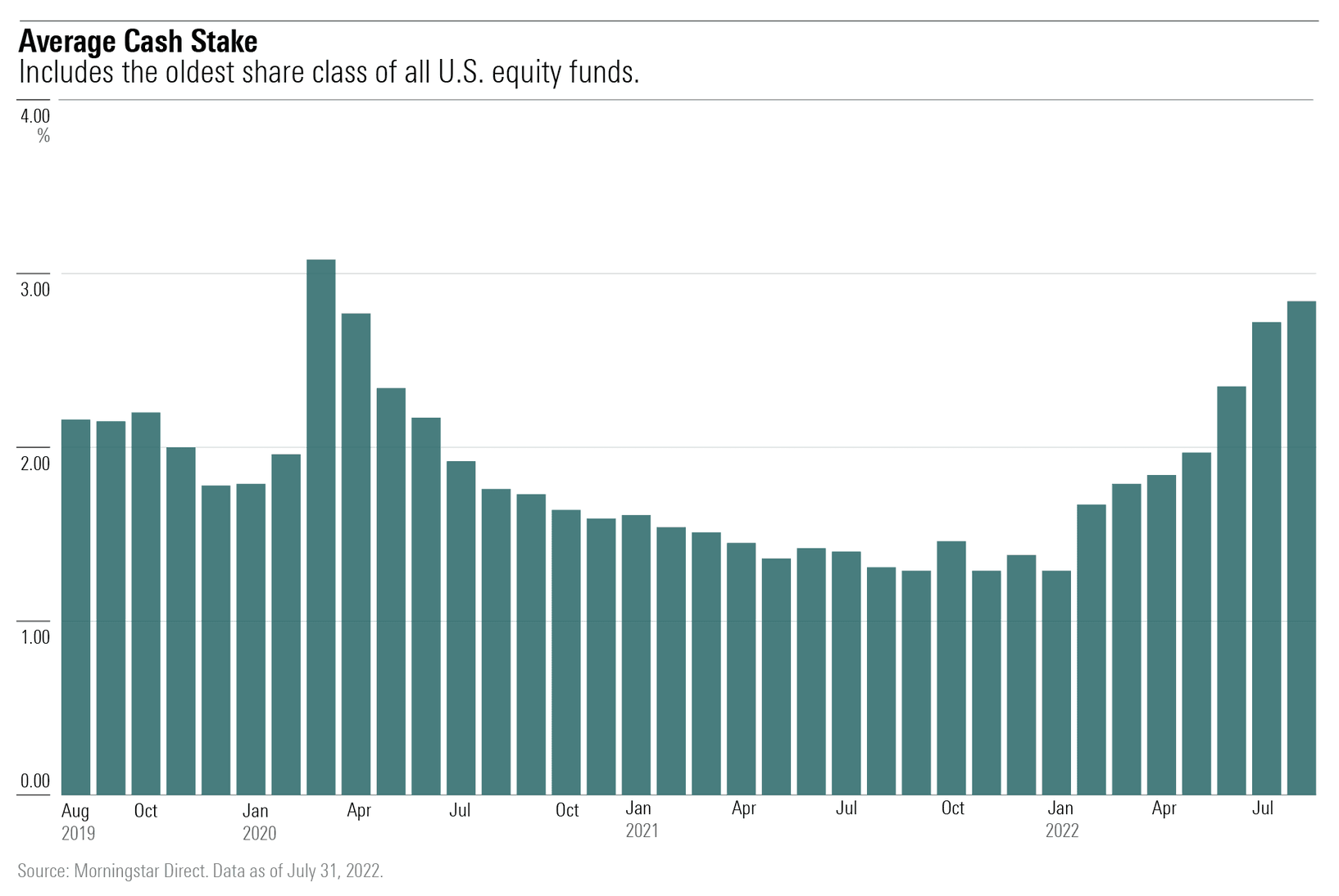 For this reason, cash positioning was always an intriguing signal for me with respect to the current conviction of a particular manager. Their exposure to cash was the most overt data point in determining their outlook on equity markets, whether they believed the music would keep playing or that valuations were getting excessive. Being fully invested (with near zero exposure to cash) signaled they believed prices still had room to run; they couldn’t afford to be sitting in cash and risk not participating fully in that upside. More meaningful cash positions (in the double digits as a percentage of the portfolio), signaled a more cautious view.