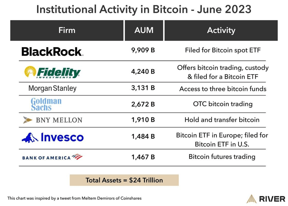 In June 2023, Wall Street firms collectively representing $24 trillion+ of AUM have filed for bitcoin and crypto ETF products. This has also come with a change of tune regarding bitcoin’s merit as an asset.