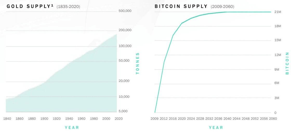 Bitcoin improves on the scarcity of gold by introducing a finite amount that can ever exist. Not only is there a fixed number of bitcoin that will ever exist, but the issuance of bitcoin rate decreases over time.