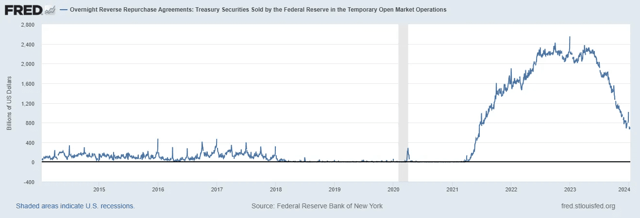 The RRP represents cash parked at the Fed earning the Fed funds rate (currently 5.5%). A big chunk of this cash is coming from money market mutual funds.