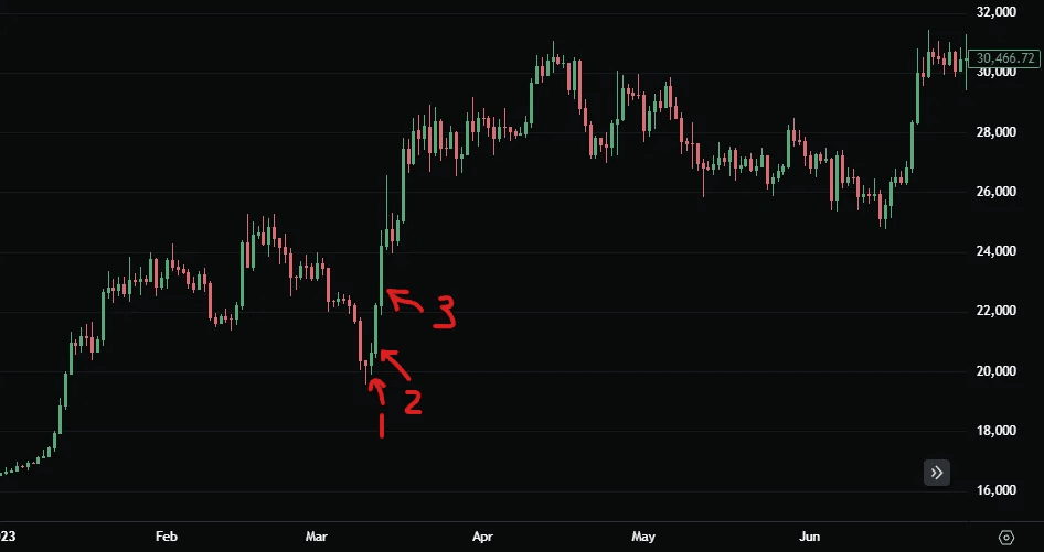 On Monday, 3/13 when equity markets re-opened, bitcoin was in the process of putting in its third consecutive massive green candle on the way to new year-to-date highs, while the KRE fell another 12%.