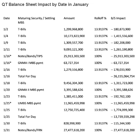 The Fed’s $95 billion a month QT program is scheduled to unfold as follows in January (courtesy of John Comiskey):
