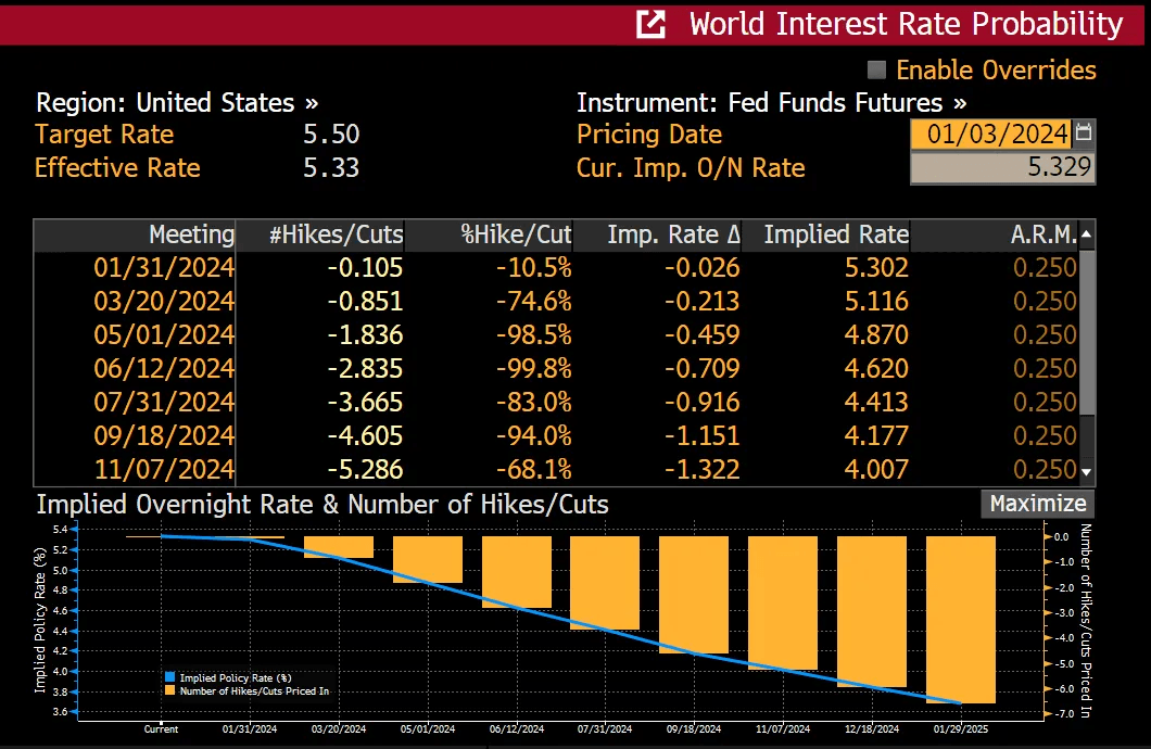 Moreover, the market is pricing in a whopping 6 rate cuts in 2024, and implying a ~4% fed funds rate by year’s end.