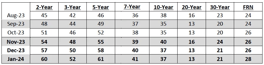 The table below presents, in billions of dollars, the actual auction sizes for the August to October 2023 quarter and the anticipated auction sizes for the November 2023 to January 2024 quarter that were released at the November QRA: