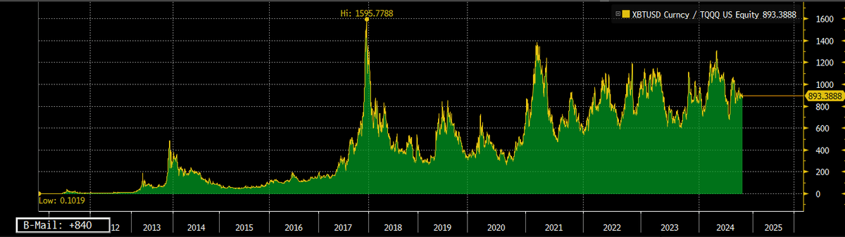 “Chart of bitcoin since inception denominated in $TQQQ (3x levered QQQ). Higher means bitcoin outperforming TQQQ, lower means bitcoin underperforming TQQQ. Up and to the right for most of the past 15 years, albeit with some vital volatility.”