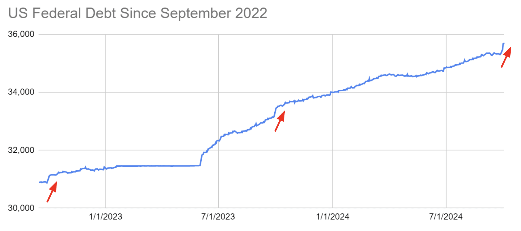 Second, at the start of every fiscal year in October, the U.S. Federal debt jumps as we see highlighted by the three arrows representing the start of FYs 2022, 2023 and 2024, which was last week.