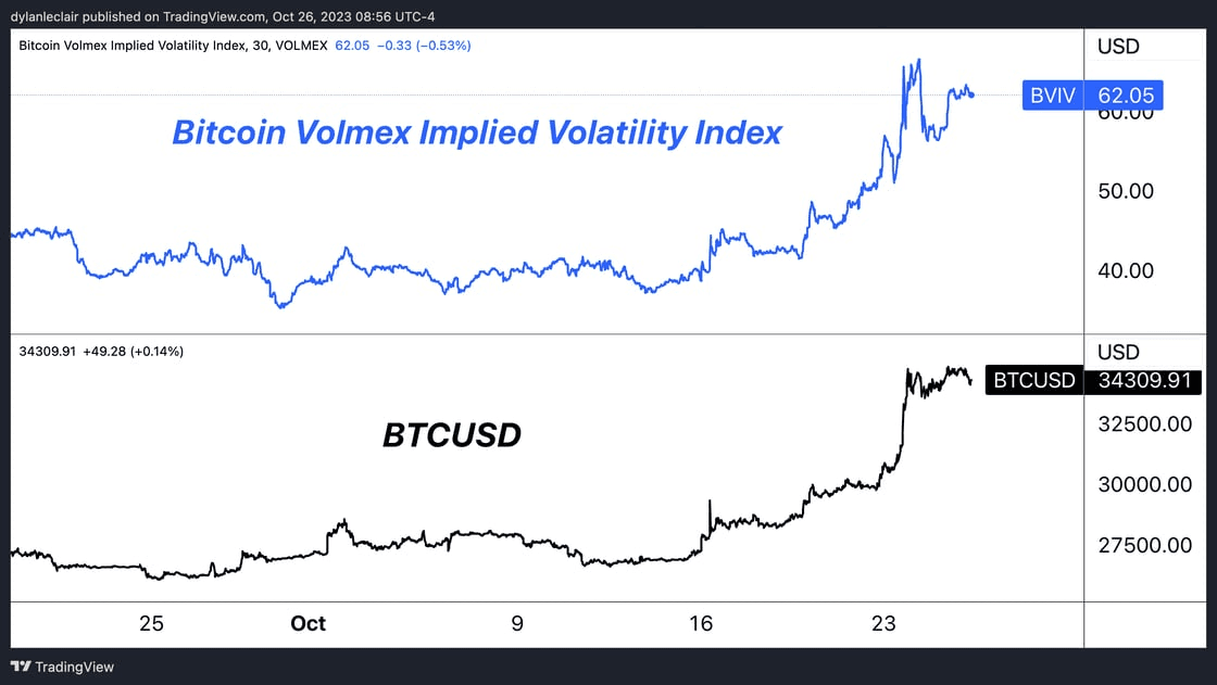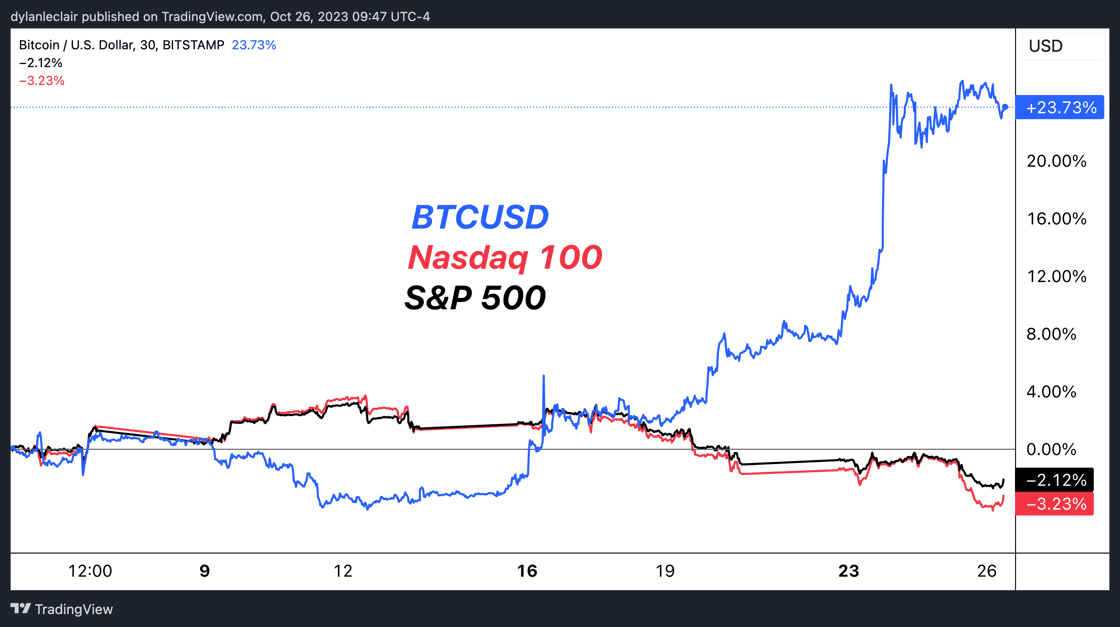 Coupled with increased chatter and speculation about possible approvals for spot ETFs, the price began creeping toward a pain point for entities that had sold upside options on bitcoin’s performance (short call options). This trend accelerated as volatility spiked, and the price continued to rise, culminating in an explosion to highs surpassing $35,000—even amidst downside pressure in equities and bond markets.