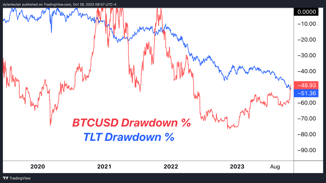 Just last week, the Onramp Weekly Roundup issue again spent time focusing on the performance of bonds. We pointed out that bitcoin’s decline from its all-time high was nearing the current drawdown experienced by long-duration government bonds—traditionally considered the ultimate “risk-free” asset.