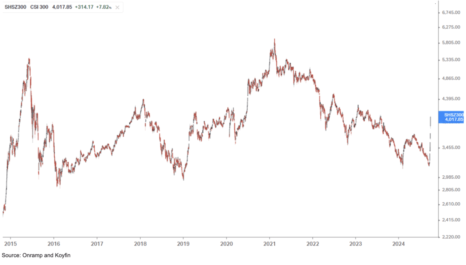 As the below graph shows, China’s CSI 300 has chopped sideways for the better part of a decade, punctuated by sharp spikes that eventually give way. The largest spike was 2015, when the government injected liquidity to boost the moribund equity market.