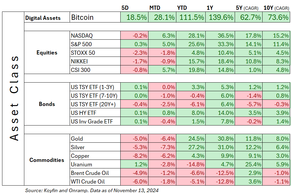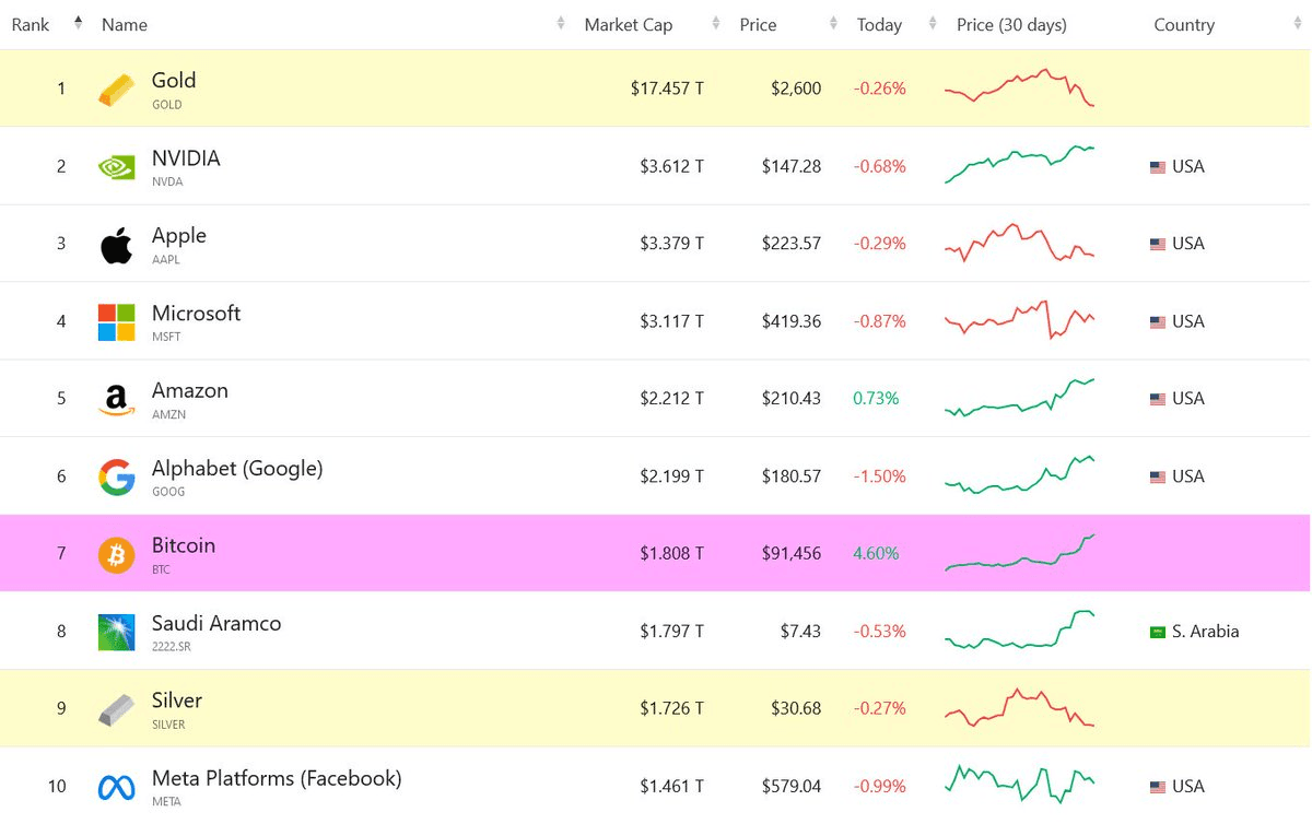Something does not add up or markets are saying that both will happen. The Fed will cut AND the US yield curve will move higher in a bear steepener. The rise in U.S. rates will augment the already large U.S. deficit of ~7% of GDP, which may have fueled bitcoin’s recent rally through $93,000. At this morning’s price of ~$91,300, it is the 7th largest asset in the world, just ahead Saudi Aramco.