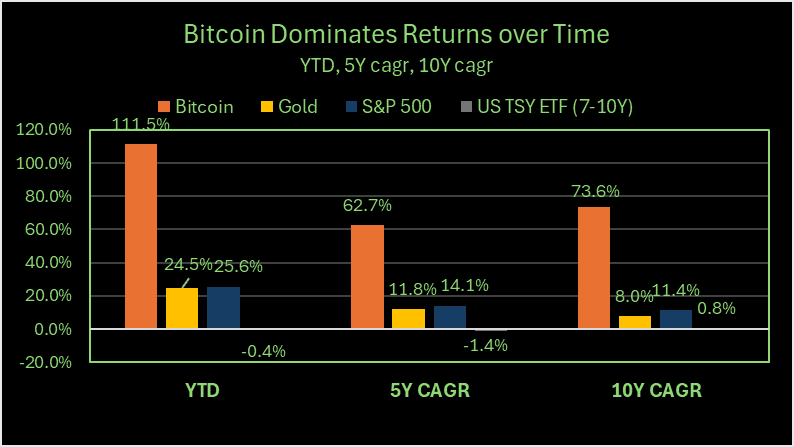Bitcoin is yet again the leader in the clubhouse MTD, YTD, and over most any time frame as illustrated below.