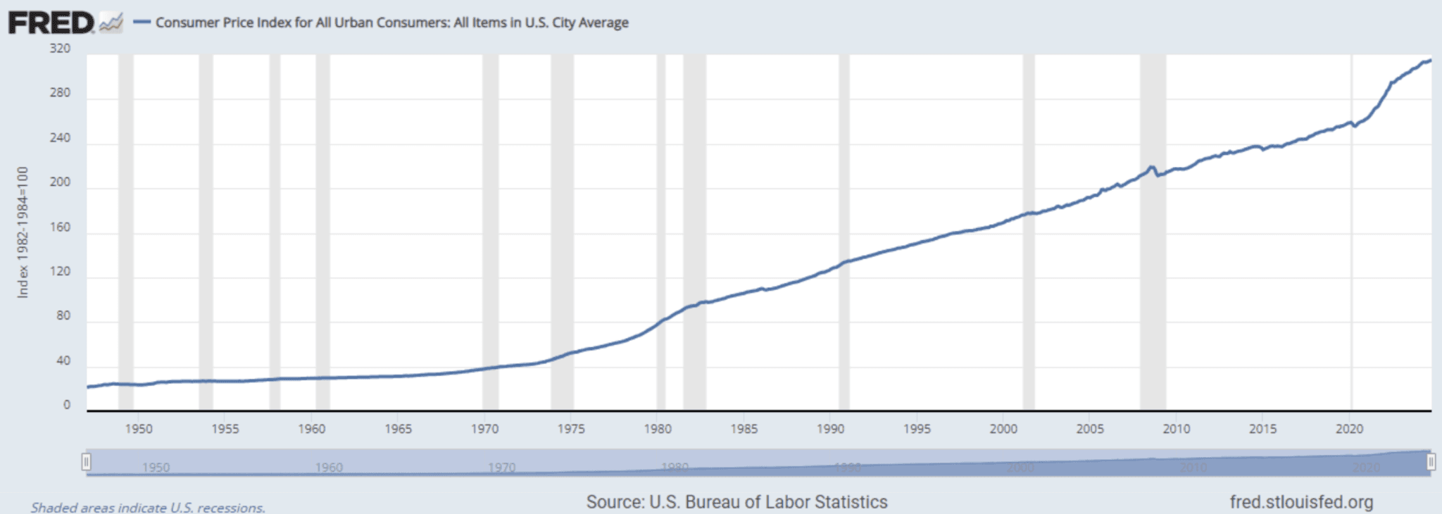 Yesterday, the CPI print came in a modesty higher, but overall as expected at +2.6% with Core CPI (ex-food & energy) at +3.3%. While 2.6% seems like a small number, the compounding of these steady price increases are material over time, as the chart below shows.