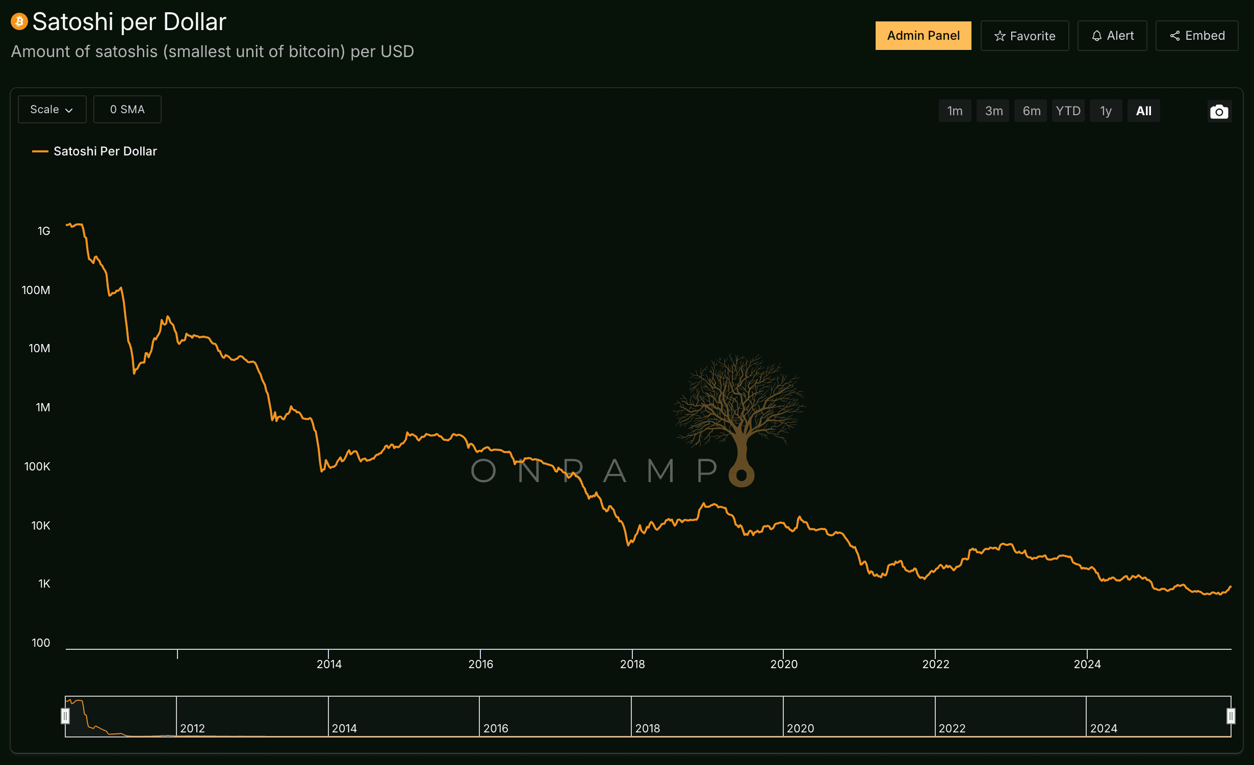 Sats are on sale. The line shows how many satoshis you receive for each dollar. For most of bitcoin’s history that number has been falling. This current bump higher means your debasing dollar briefly buys more sats than it did a few weeks ago. Short-term reversals like this are the discount window. [Onramp Terminal]