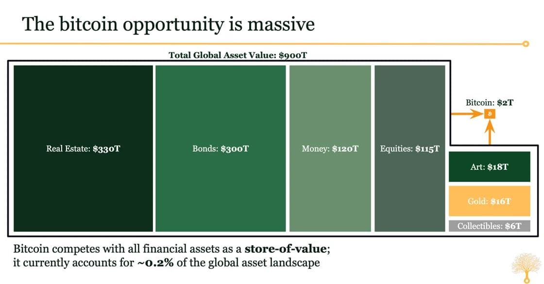 Even after a strong run up and a painful pullback, bitcoin’s market cap is roughly two trillion dollars. Put that next to a global asset stack that adds up to something close to a quadrillion: