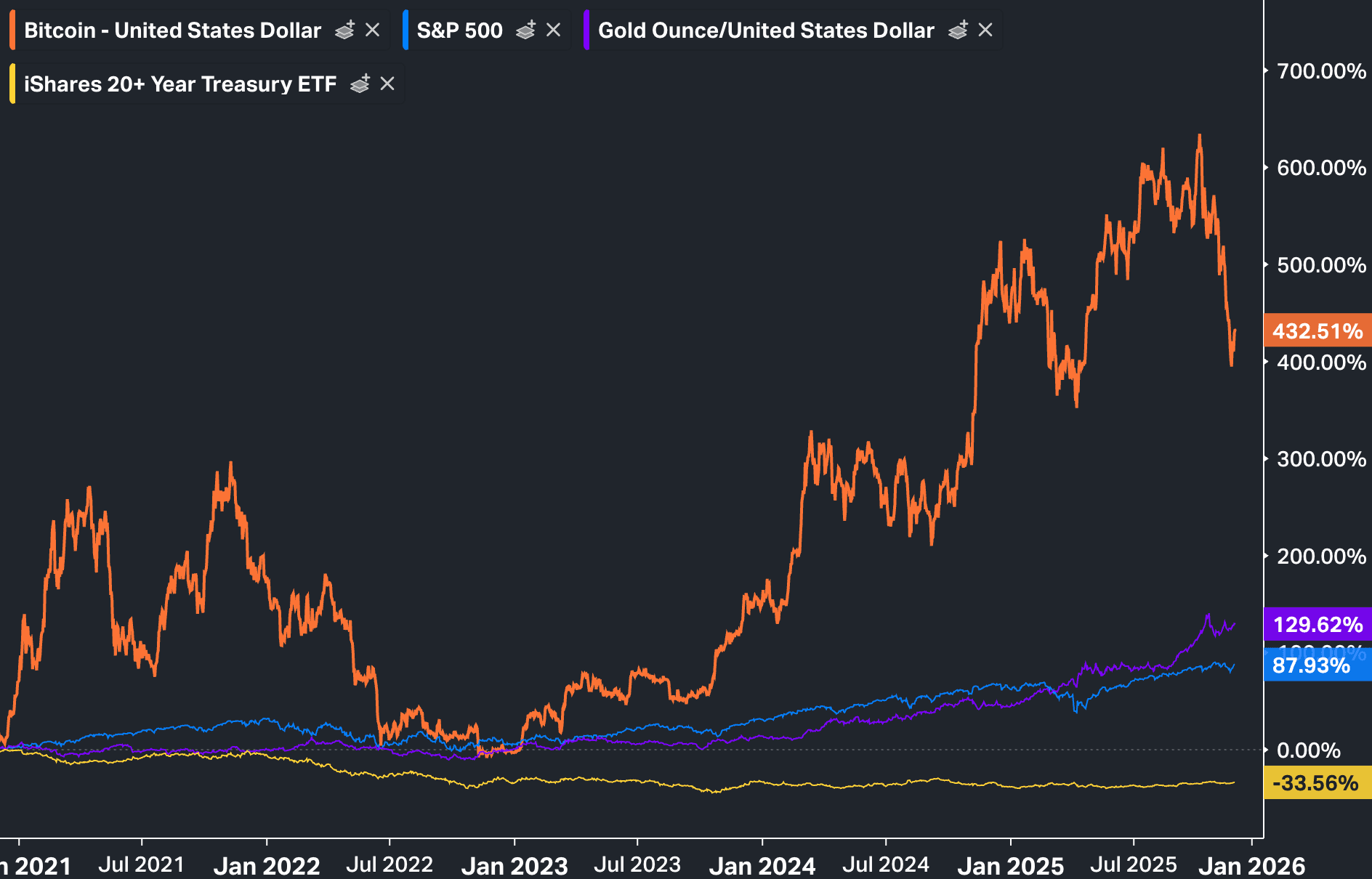 If you zoom out to real multi-year windows, bitcoin looks very different from the way it feels day to day. Over longer stretches of time, it has meaningfully outpaced stocks, bonds, and gold in both absolute returns and in how quickly it recovers from drawdowns. You do not have to squint or cherry-pick one perfect starting point to see that.