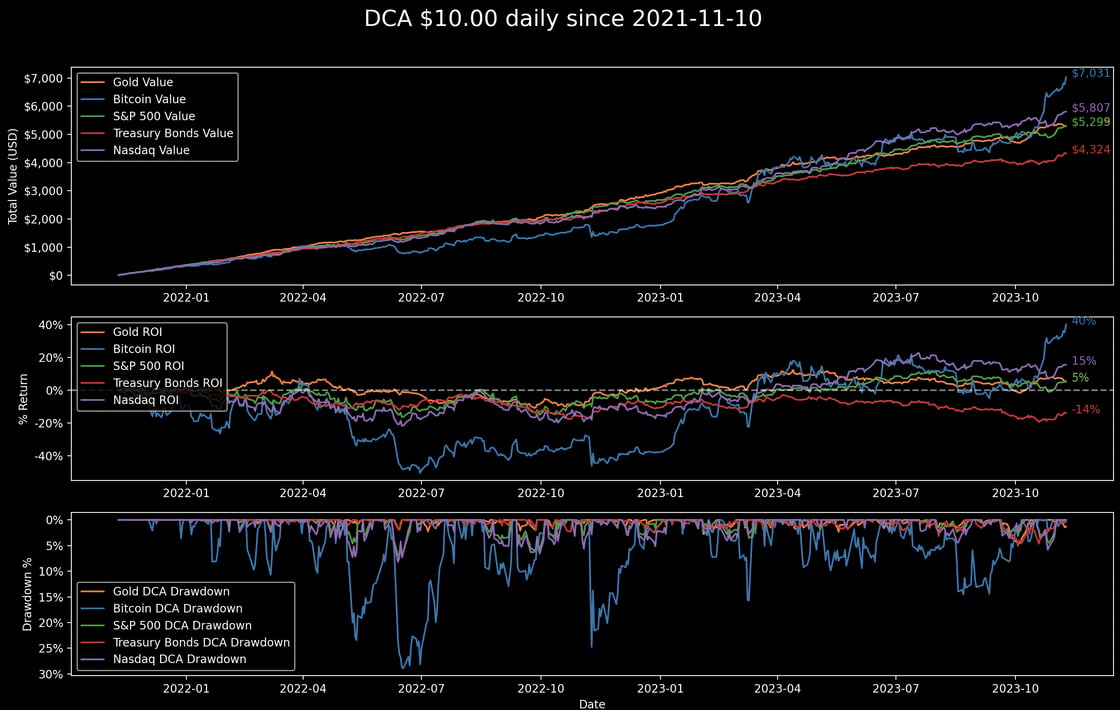 Starting from the day of the November 2021 $69,000 bitcoin all time high, a daily dollar cost averaging strategy has yielded returns of +40% for bitcoin, +15% for the Nasdaq, +5% for the S&P 500 and gold, and -14% for U.S. long duration bonds.