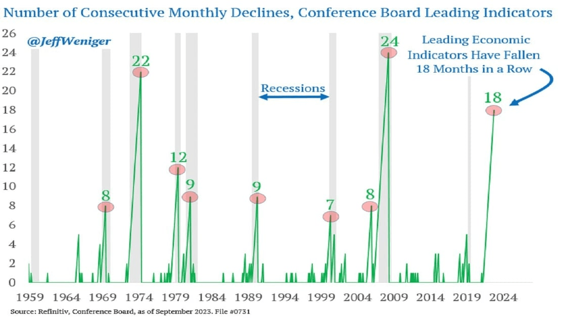 Turning our attention to the economy, Jeff Weniger, Head of Equities for WisdomTree published quite a staggering indicator, showing 18 consecutive declines in reports from the Conference Board’s leading economic indicators.
