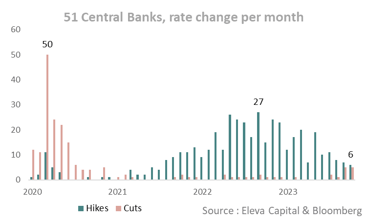 Stephane Deo from Eleva Capital points out a recent pivot in global monetary policies. In October, the count of rate hikes by central banks worldwide dropped to six, the lowest since July 2021, while rate reductions climbed to five, a peak not seen since July 2020. This trend, especially the Federal Reserve’s pause at what seems to be the peak rate of this tightening cycle, suggests that central banks are now pausing to evaluate the impact of previous hikes amid a slowdown in global economic growth and the past year’s disinflationary patterns.