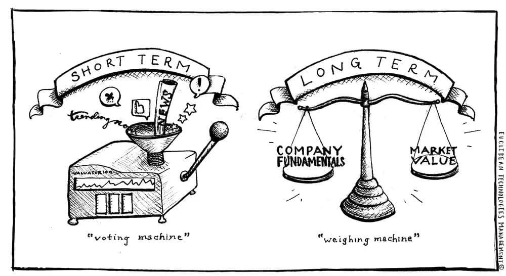 A useful reference point comes from traditional value investing. Warren Buffett, quoting Ben Graham, wrote: “In the short run, the market is a voting machine but in the long run it is a weighing machine.”