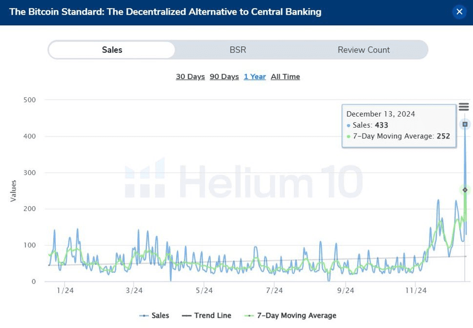 This perspective aligns with our previous commentary: short-term market responses to the Fed’s pronouncements are often noise, while the underlying structural case for bitcoin strengthens over time. Key metrics—rising hash rate, increasing on-chain activity, expanding network participation, and greater cultural adoption (see the uptick in sales of “The Bitcoin Standard” pictured below)—continue to point in the same direction.