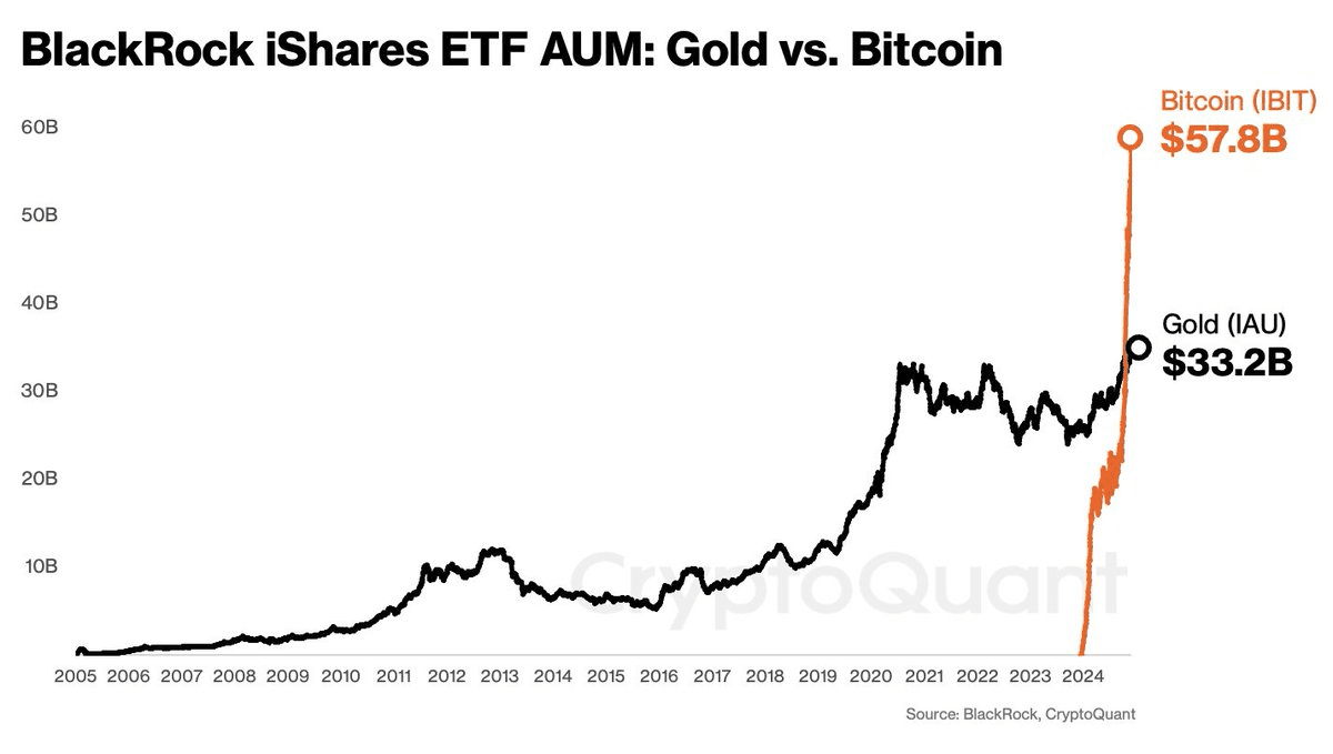 “BlackRock’s gold ETF took 20 years to reach $33B AUM, while their #Bitcoin ETF nearly doubled gold’s AUM in less than a year.”