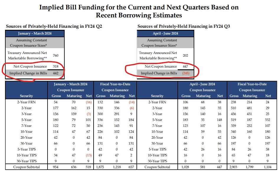 Perhaps the more important reveal was the Treasury’s borrowing estimates for the April-June quarter; in particular, a -$245 billion implied net change in bill issuance: