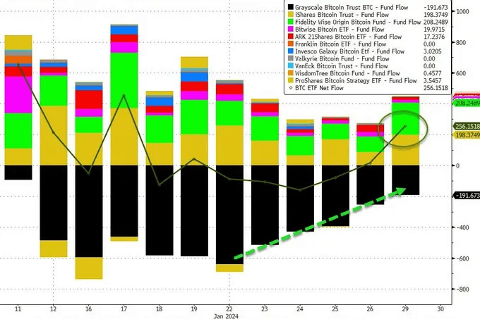 The $192 million out of GBTC was outpaced by over $200 million in for both IBIT (BlackRock) and FBTC (Fidelity):