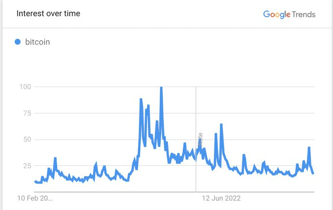 Google web searches for keyword “bitcoin” currently index at 19, meaning the search term is 19% as popular as it was at its 2021 peak.