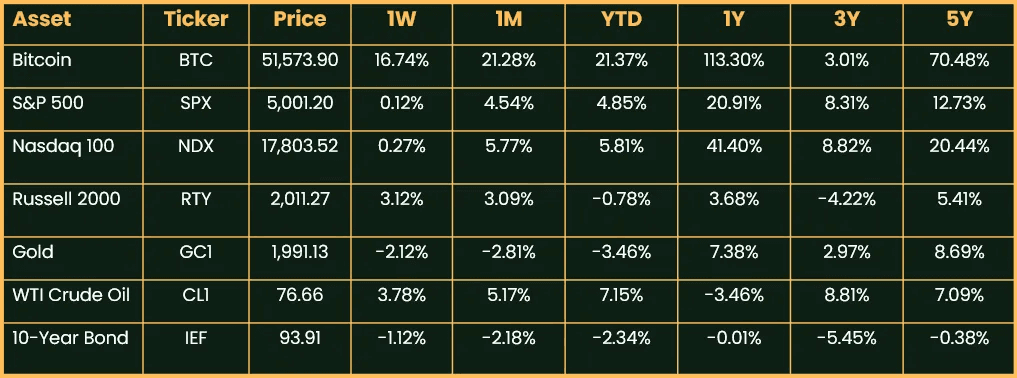 Assets generally shook off a hotter than expected January CPI print to close up for the week and continue a strong start to the year. Bitcoin rallied to above $50k, a level not seen since December 28th, 2021. It remains the best performing asset in YTD and 1Y periods. US large cap stocks continued their ascent, fueled by positive Q4 earnings reports and renewed enthusiasm around the AI-theme. Small caps outperformed on the week but still lag YTD. Gold and bonds fell as rates rose in reaction to the upside surprise in inflation. Oil rallied 3.78%.