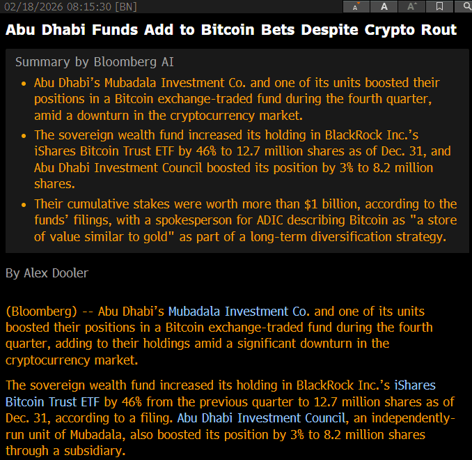The timing and the framing tell the real story. These purchases were made into bitcoin price weakness. A spokesperson for ADIC described bitcoin as "a store of value similar to gold" and framed the allocation as part of a long-term diversification strategy. That language reflects the output of a multi-year asset allocation review, structural conviction, and the kind of patience that sovereign mandates uniquely allow.