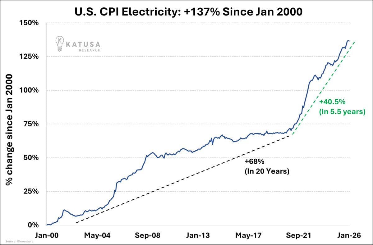 "It took 20 years for US electricity prices to rise 68%. Then it took 5.5 years to add another 40%. Now add AI data centers, EVs, and a grid built for 1985. This line probably won’t flatten."