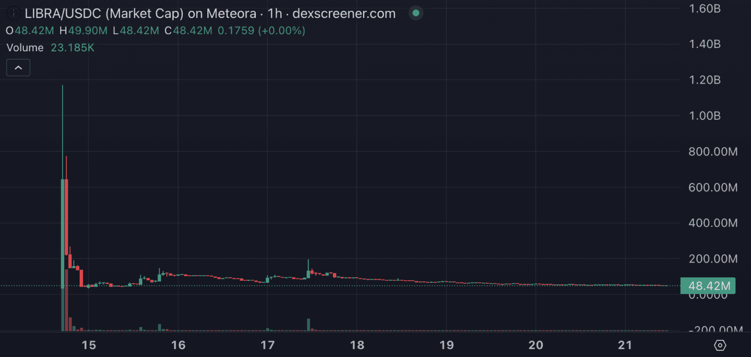 In recent weeks, a string of high-profile memecoin collapses—most notably tied to political figures such as Argentinian President Javier Milei ($LIBRA token chart shown below) and the Trump family—has erased billions in market value, leaving retail investors reeling. The memecoin playbook is simple: artificially inflated market caps give way to sudden liquidity drains as insiders or founders cash out.