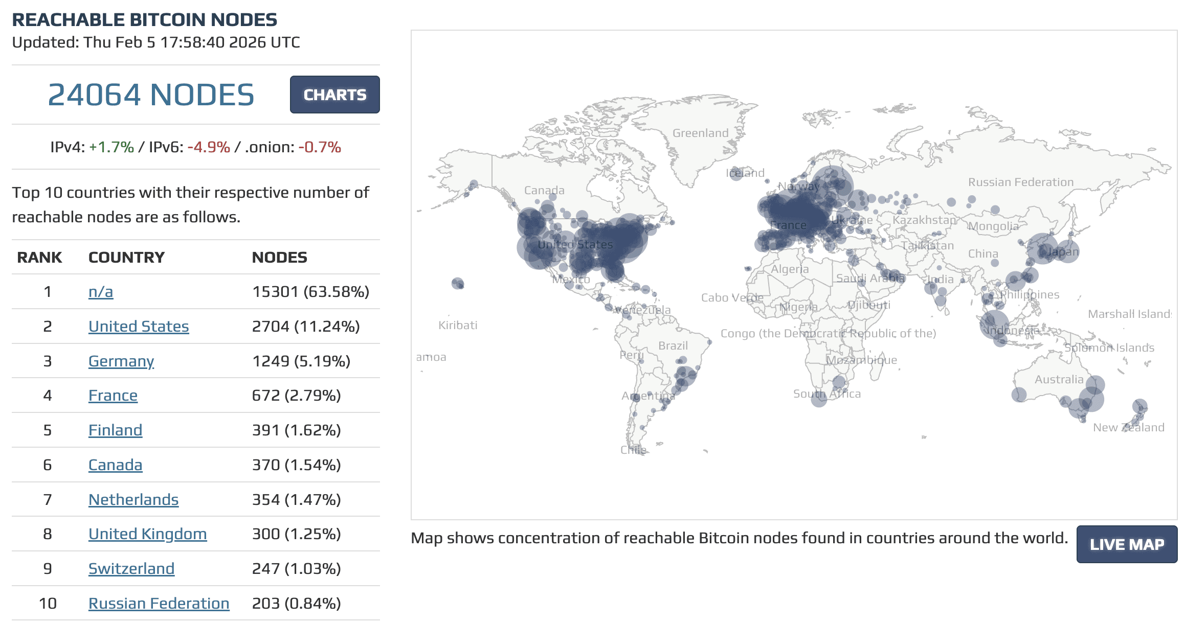As of early 2026, there are approximately 24,000 reachable bitcoin nodes operating across more than 150 countries. Each node independently validates every transaction and every block against the protocol's consensus rules. If a miner produces a block that violates the rules, every node on the network will independently reject it. No committee decides which transactions are valid. No authority can change the rules. There is no backdoor.
