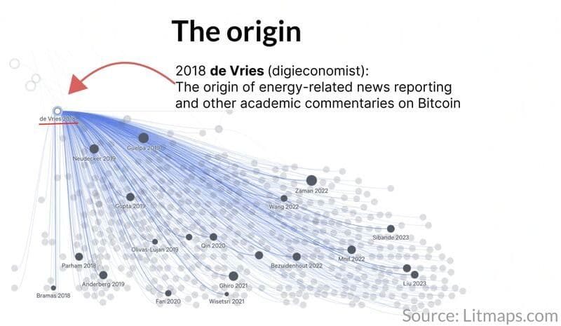 "Litmaps, a powerful research tracking tool, reveals that patient zero for all junk science on Bitcoin's environmental impact was a single 6 page "commentary" by Alex de Vries. (A commentary in the context of an academic journal means a short opinion piece that does not to go through a full peer-review process and which does not use novel empirical data).