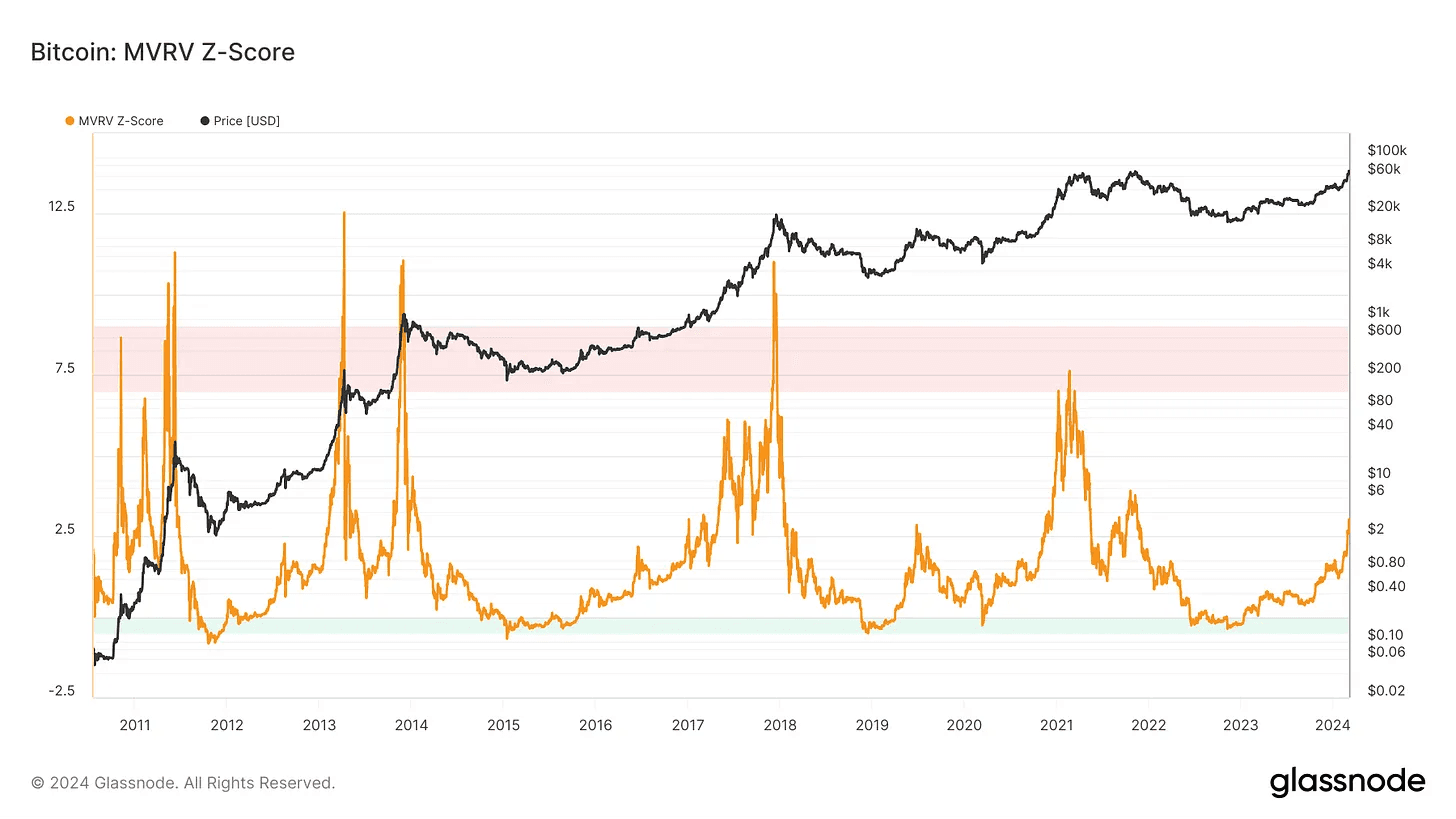 While the MVRV Z-Score has breached 3, no prior cycle tops have occurred without it hitting at least 7, as indicated by the bottom of the red band in the chart below: