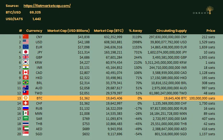 BTC may not have hit a new all-time high in terms of the Swiss franc just yet, but the Swiss currency did briefly give up its spot to bitcoin as the 13th largest global currency by market cap: