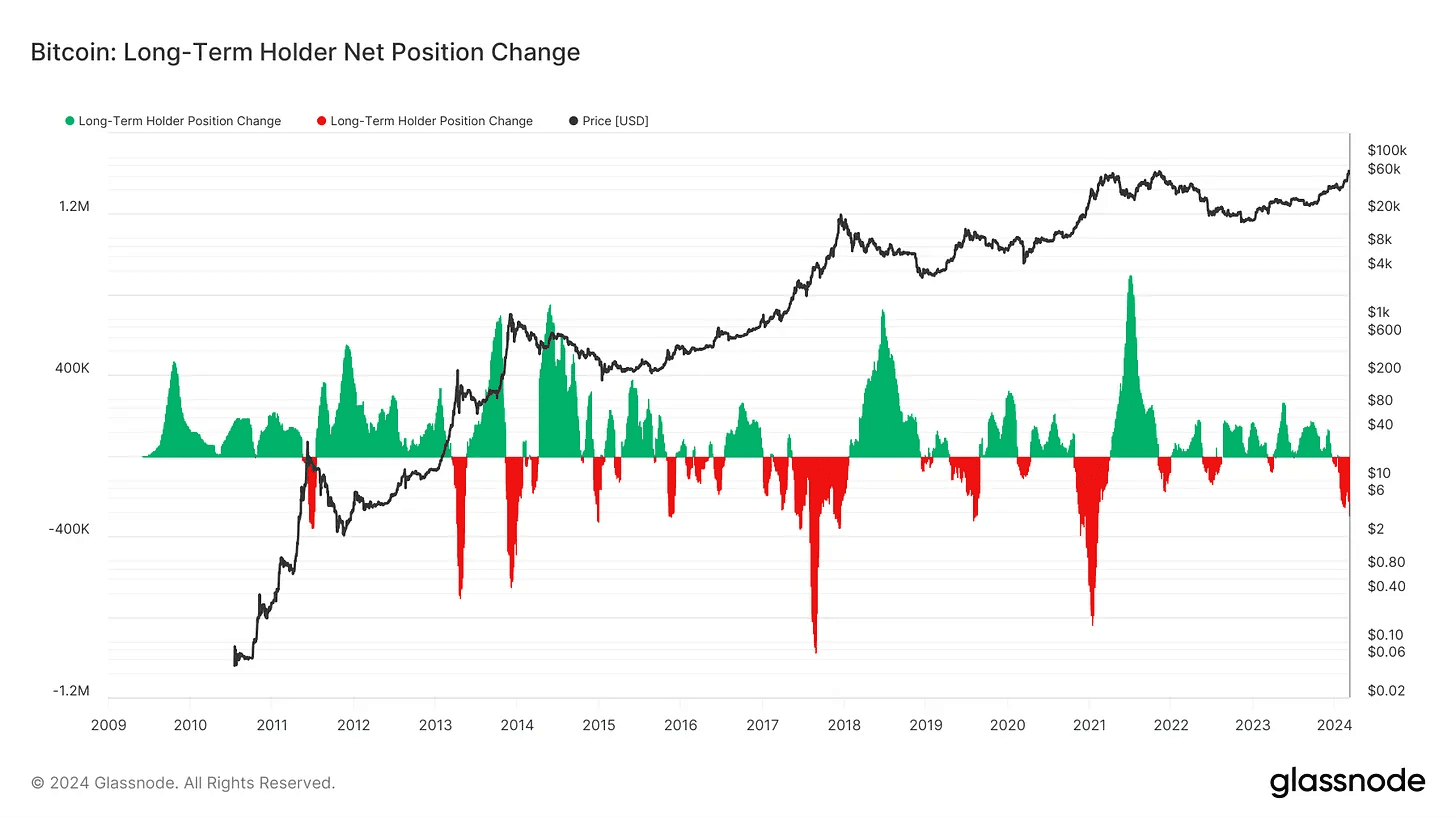 While long-term holders (coins not moved in over 155 days) have begun distributing, as shown in the top chart below, if we zoom out we can see that the supply held by long-term holders is still near all-time highs and the current levels of distribution does not yet mirror what we saw during the 2017 and 2021 prior cycle peaks: