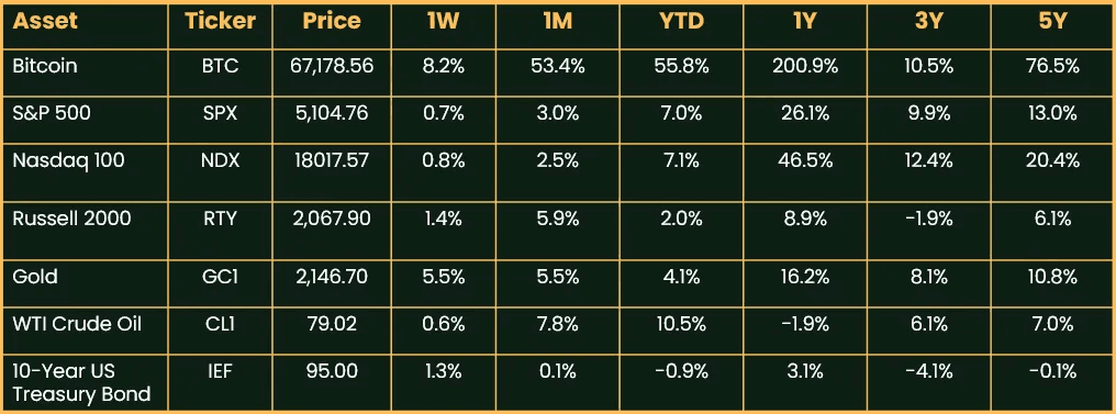 Bitcoin continued its rally and finished the week up 8.2% after briefly eclipsing all-time highs earlier in the week. The asset has now tripled in the past year. Stocks were mostly flat as the market digested a number of executive presentations at the Morgan Stanley Tech, Media, and Telecom Conference in San Francisco, the largest TMT investor conference of the year. Gold spiked 5.5% and looks to be breaking out of a 3.5 year trading range, perhaps anticipating new liquidity measures to respond to renewed banking sector woes as New York Community Bank did an emergency $1 billion capital raise. Oil rallied in response to news of extended OPEC production cuts, before consolidating and finishing the week up 0.6%. Yields fell and bond prices rose 1.3%.