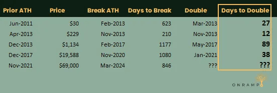 On each of its four previous breaks of all-time-highs (disregarding the November 2021 double-top break of the previous May 2021 all-time-high), the bitcoin price has doubled in as little as 12 days (on the November 2013 break of previous ATH), and no more than 89 days (February 2017 break of previous ATH).