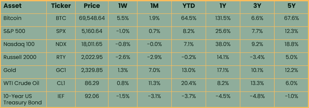 Hard assets bitcoin, gold and crude rallied on the week while stocks and bonds fell. Bitcoin was the best performer, staging an impressive rally on Wednesday after initially falling in reaction to a hotter-than expected CPI print which weighed on all assets. CPI was a reported 3.4% year over year vs. expected 3.3%, stoking fears of a rebound in inflation and contributing to the weekly decline in stock indices. Gold gave back some recent gains but still sits near new all-time highs and held on to a 1.3% gain for the week. As mentioned, gold has now performed in-line with the S&P 500 over a 5-year period for the first time since 2012. Bonds sold off as the 10-year US treasury yield rose back above 4.5%.