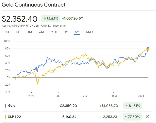 A symbolic threshold was passed this week when gold’s 5-year performance eclipsed that of the S&P 500: