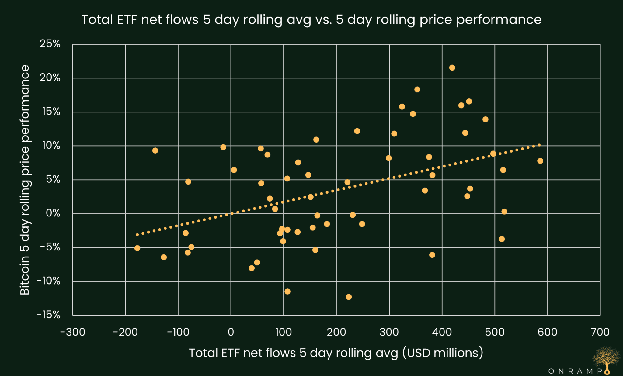 We took a look at the correlation between 5 day rolling average ETF flows and 5 day rolling bitcoin price performance: