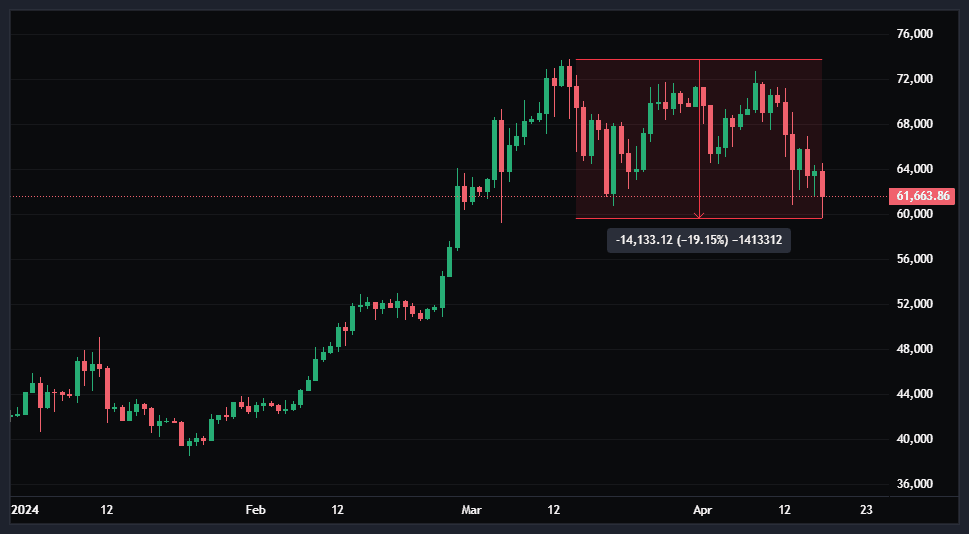 After setting a new all-time high of $73,836 on March 13th, bitcoin recently fell as low as $59,648 for a peak-to-trough drawdown of 19.2%.