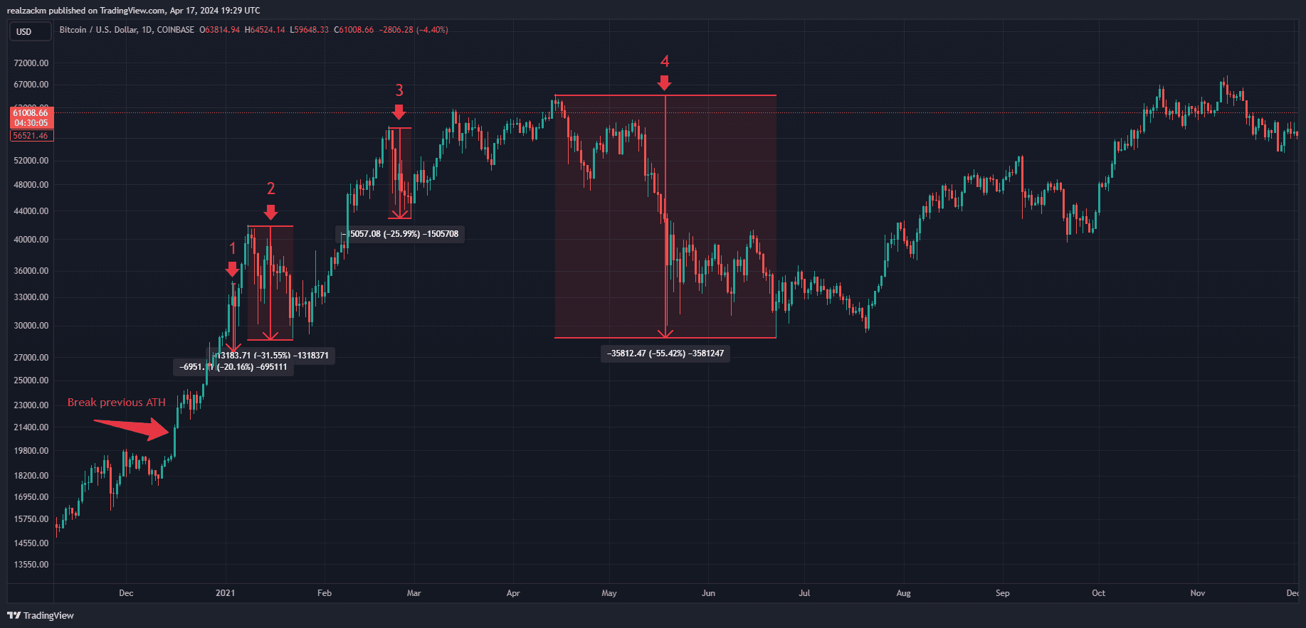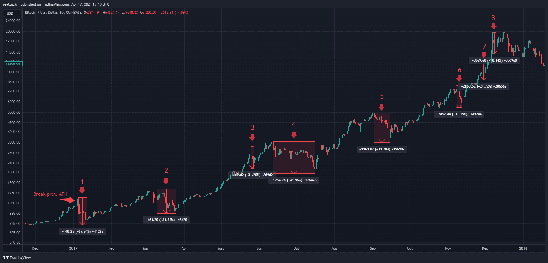 During that 11 month run, bitcoin experienced 8 drawdowns of 20% or more, including one immediately upon breaking the previous ATH as we are experiencing now: