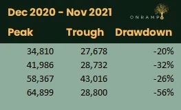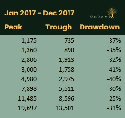 During that 11 month run, bitcoin experienced 4 drawdowns of 20% or more: