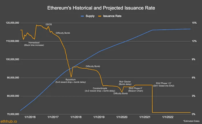 ETH’s monetary policy has been altered several times in its history, most recently with the merge from a proof-of-work to proof-of-stake consensus model in 2022. The below chart illustrates the change in ETH’s annual issuance rate over time: