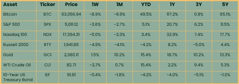 Bitcoin led all risk assets lower on the week as escalation between Iran and Israel over the weekend stoked fears of a larger conflict. The stock market continues to try and find its footing after a hot CPI print last week sparked concern of a second wave of inflation. Bank reserves likely fell as US taxes were due on April 15, removing liquidity from the system on net. Gold, up 1.5%, was the best performing asset on the week as it held all-time highs. Despite the conflict in the Middle East, oil fell as the Biden Administration announced they may further drain the Strategic Petroleum Reserve to keep a lid on gas prices. Bond yields continued their year-to-date ascent, with the US 10 year rising to 4.59%.