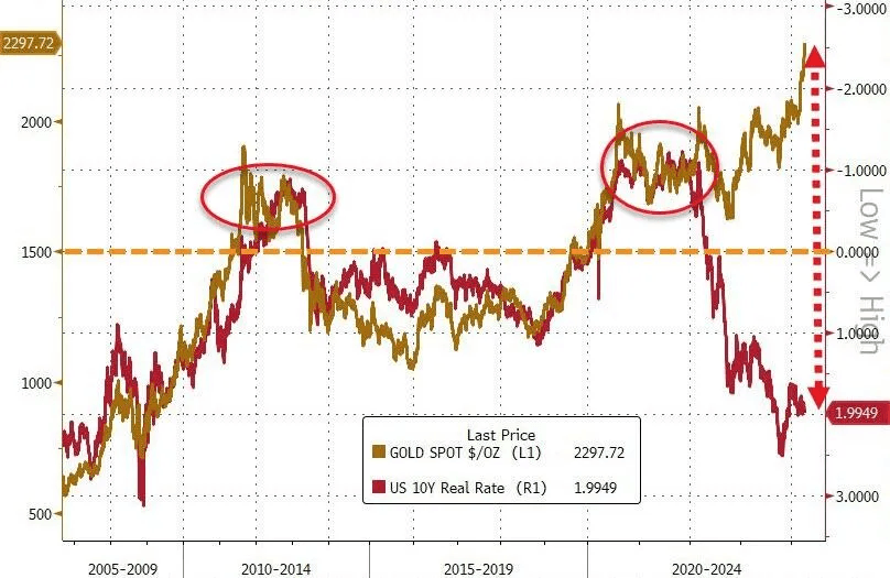 Today, gold is surging to new all-time highs despite the highest real interest rates in 15 years, suggesting either the market is anticipating a crash in real rates, or the historical correlation has broken down for other reasons and we are in a new market regime.