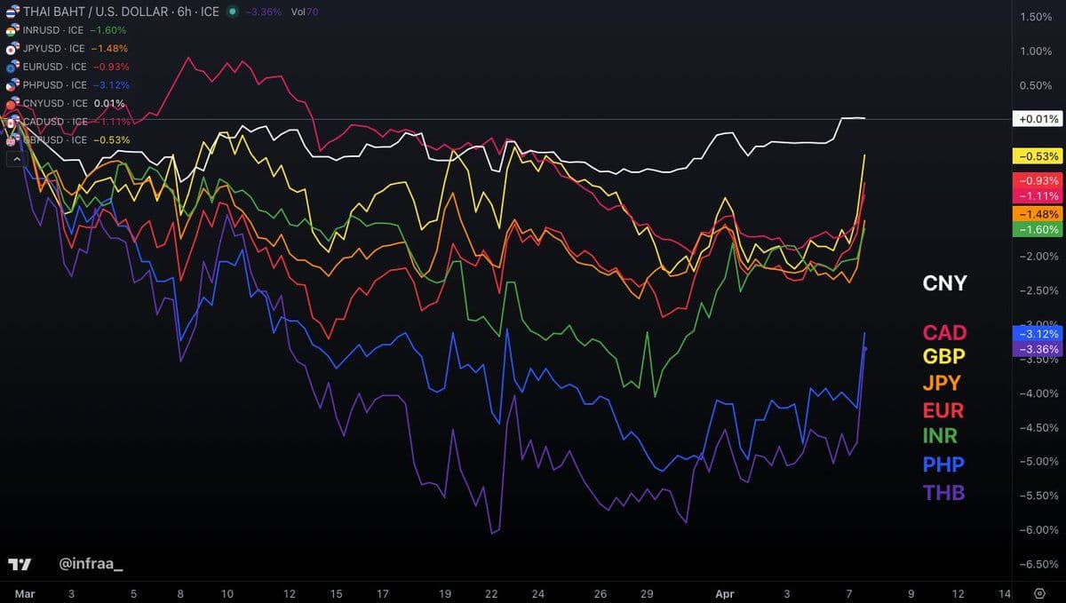 "Interestingly, since the start of the war, the only currency that has not weakened relative to the dollar is the Chinese Yuan. This comes amidst reports of tolls being paid in CNY and significant questions about the underlying foundations of the petrodollar."