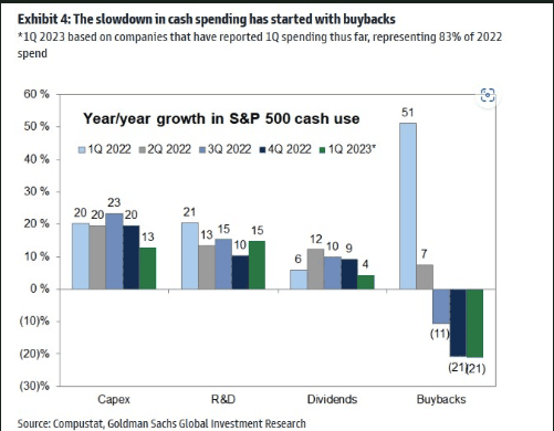 Corporate America has started to pull back on stock buybacks, as dropping profits, banking stress, and recession fears encourage companies to preserve cash. The number of announced buybacks has decreased 8% YoY, with Goldman Sachs forecasting a 15% decline for the entire year. Concurrently, the S&P 500 has witnessed a 21% YoY drop in actual buybacks, while cash balances have sunk to their lowest since 2010.